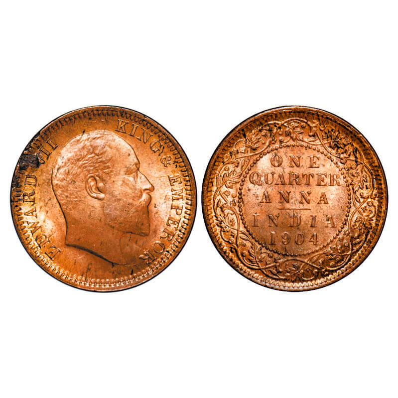 Edward VII, Copper, Quarter Anna, 1904, Calcutta Mint, No mint mark, Multiple die cracks on Obv. F. Prid 647. GK 995. Uncirculated. Scarce.