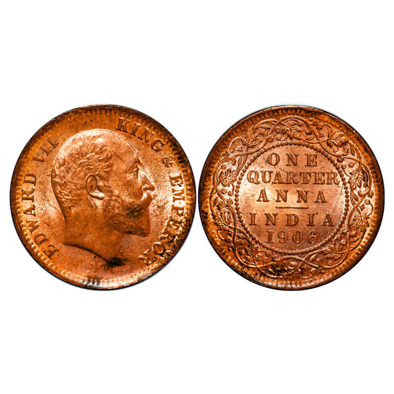 Edward VII, Copper, Quarter Anna, 1906, 6.41 gm. Calcutta Mint, No mint mark. F. Prid 650. GK 997. Uncirculated. Very Scarce.