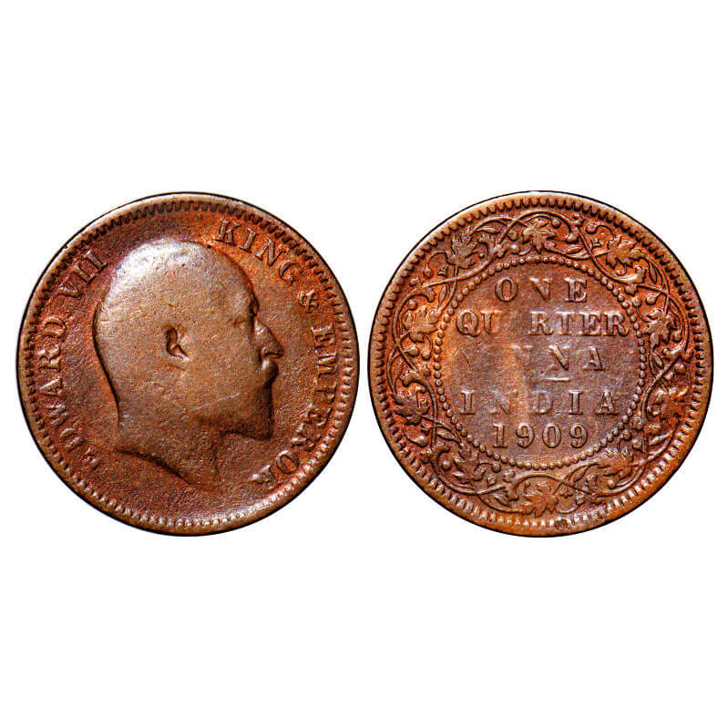 Edward VII, Bronze, Quarter Anna, 1909, Calcutta Mint, No mint mark. GK 1001. Very Fine. Scarce.