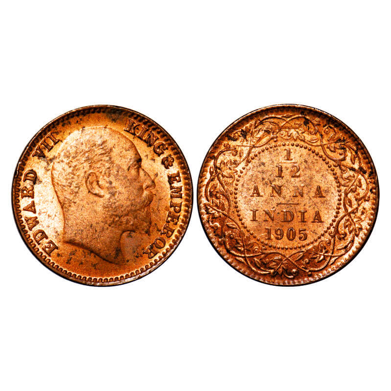 Edward VII, Copper, 1/12 Anna, 1905, Calcutta Mint, No mint mark. F. Prid 820. GK 1014. Mint State. Very Scarce.