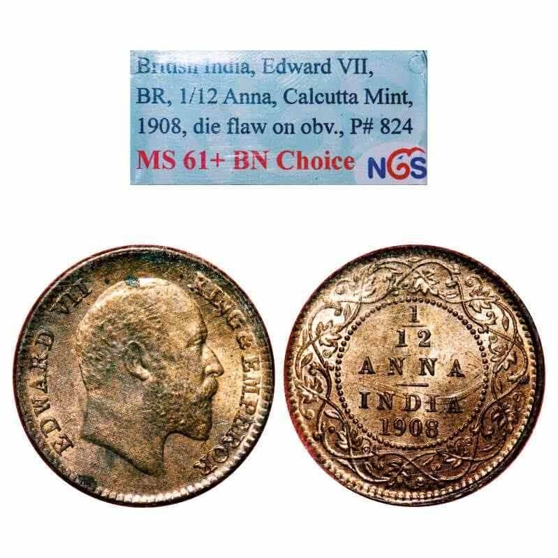 Edward VII, Bronze, 1/12 Anna, 1908, Calcutta Mint, No mint mark. F. Prid 824. GK 1018. NGS Slabbed MS 61+ BN Choice. Rare.