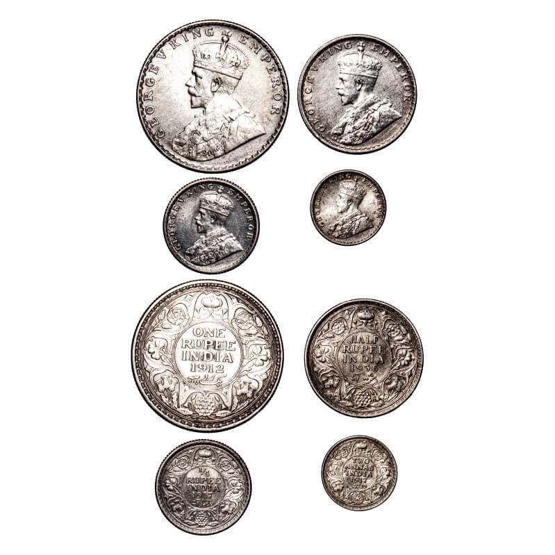 | George V, Silver, (4 coins), 1) Rupee, 1912, Bombay Mint, Dot, Re-Drawn Elephant with long tusk, 2) Half Rupee, 1936, Bombay Mint, Dot, 3) 1/4 Rupee, 1917, Calcutta Mint, No dot, 4) 2 annas, 1917, Calcutta Mint, No dot. F. Prid 218, 350, 446, 570. GK 1026, 1076, 1090, 1117. Extremely Fine+ to Uncirculated. Scarce. |