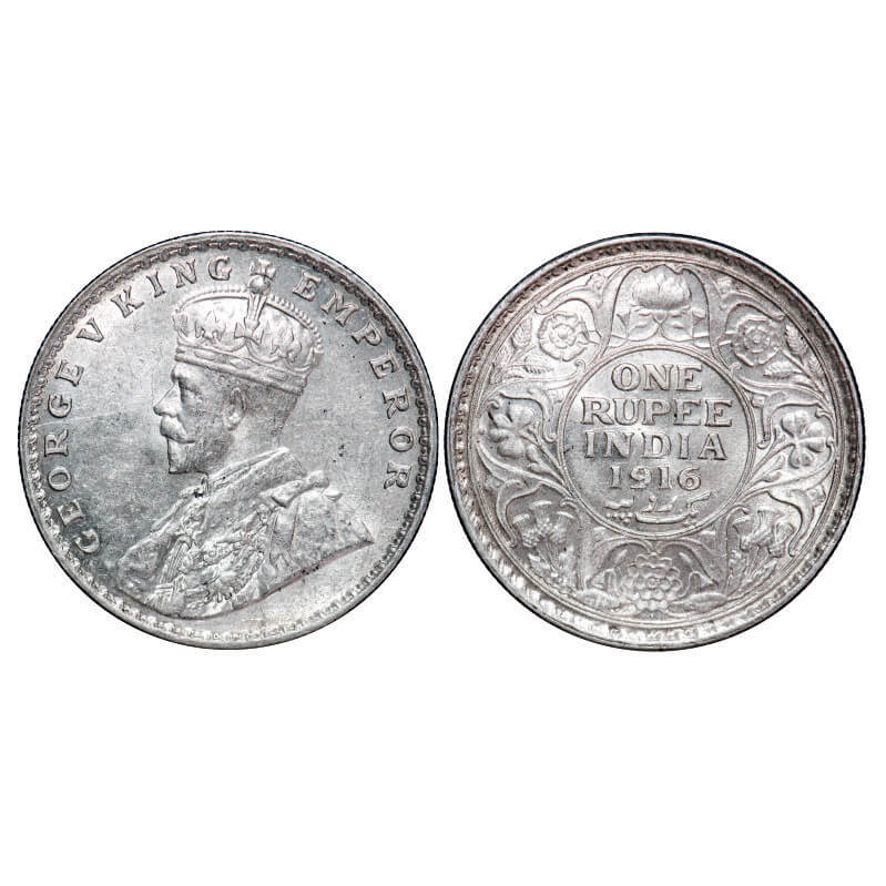 George V, Silver, Rupee, 1916, Bombay Mint, Dot, Alphabate 'D' of India is seen below the ear on Ob...