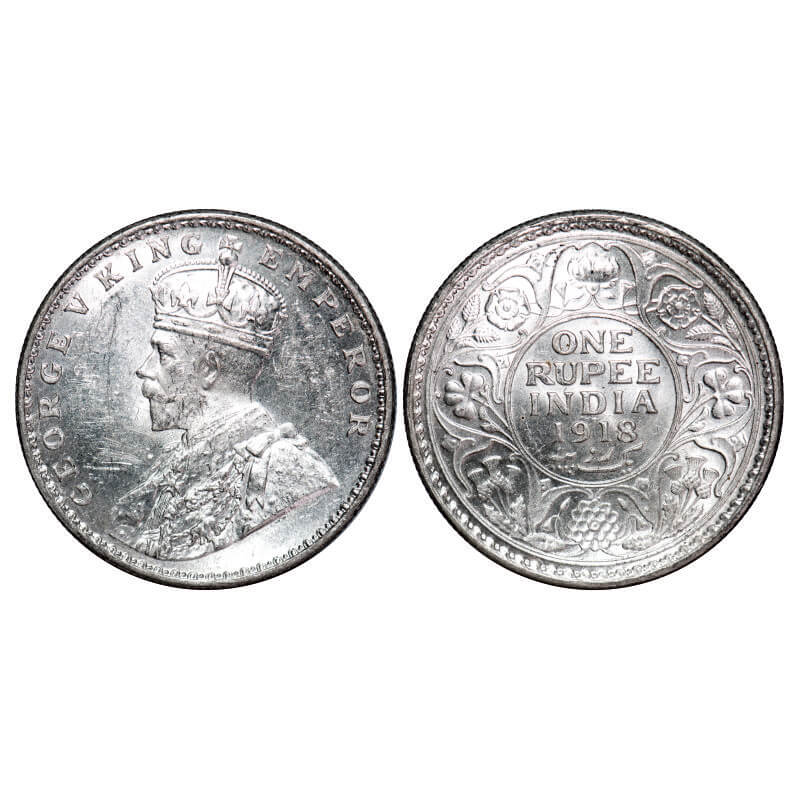 George V, Silver, Rupee, 1918, Calcutta Mint, No dot. F. Prid 214. GK 1037. Uncirculated. Very Scarce.