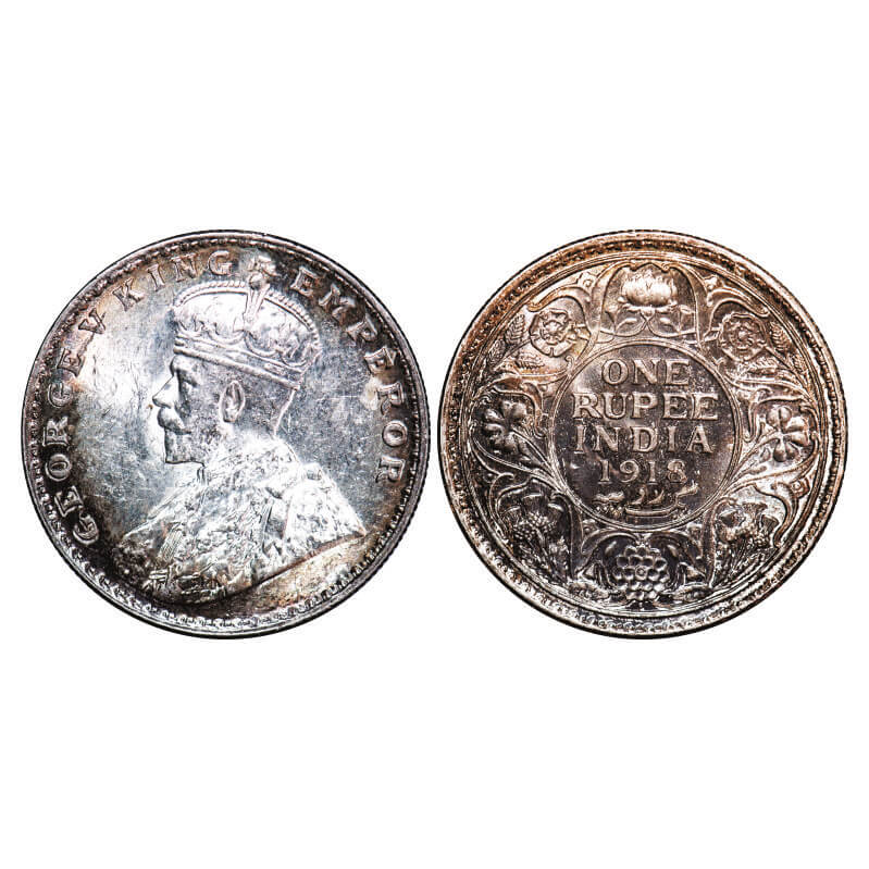 George V, Silver, Rupee, 1918, Bombay Mint, Dot. F. Prid 224. GK 1038. Brilliant Uncirculated, Rev toned. Very Scarce.