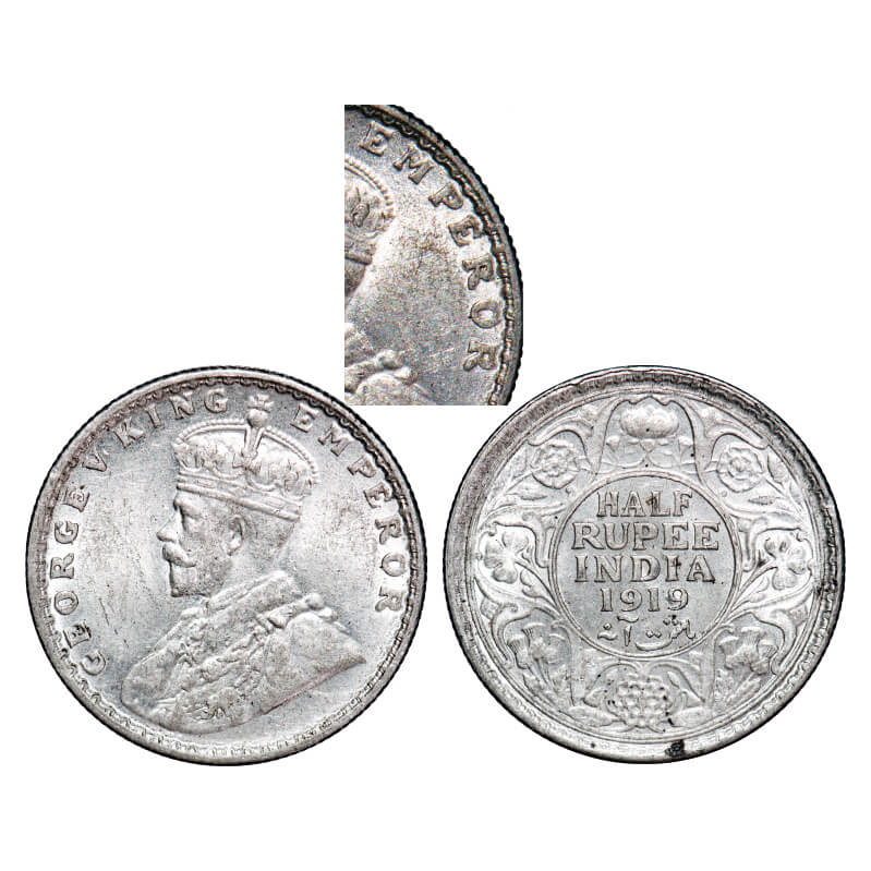 George V, Silver, Half Rupee, 1919, Bombay Mint, Dot, Bloated alphabates of Emperor on Obv. F. Prid 343. GK 1057. Uncirculated. Very Scarce.