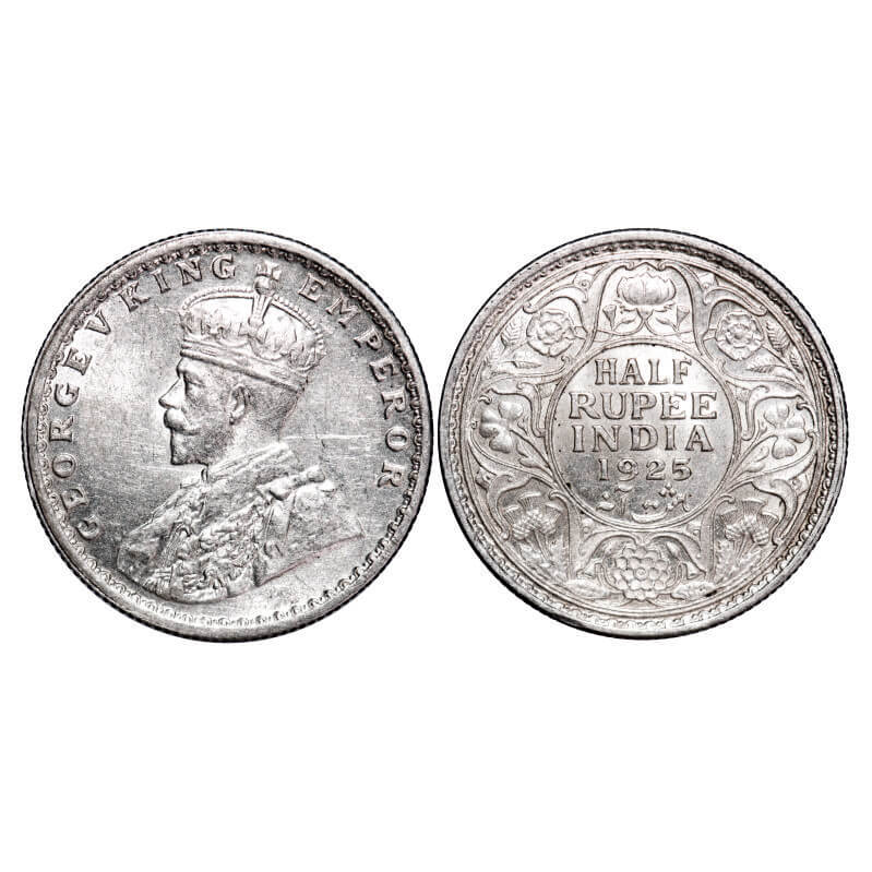 George V, Silver, Half Rupee, 1925, Calcuta Mint, No dot. F. Prid 328. GK 1065. Almost Uncirculated. Very Scarce.