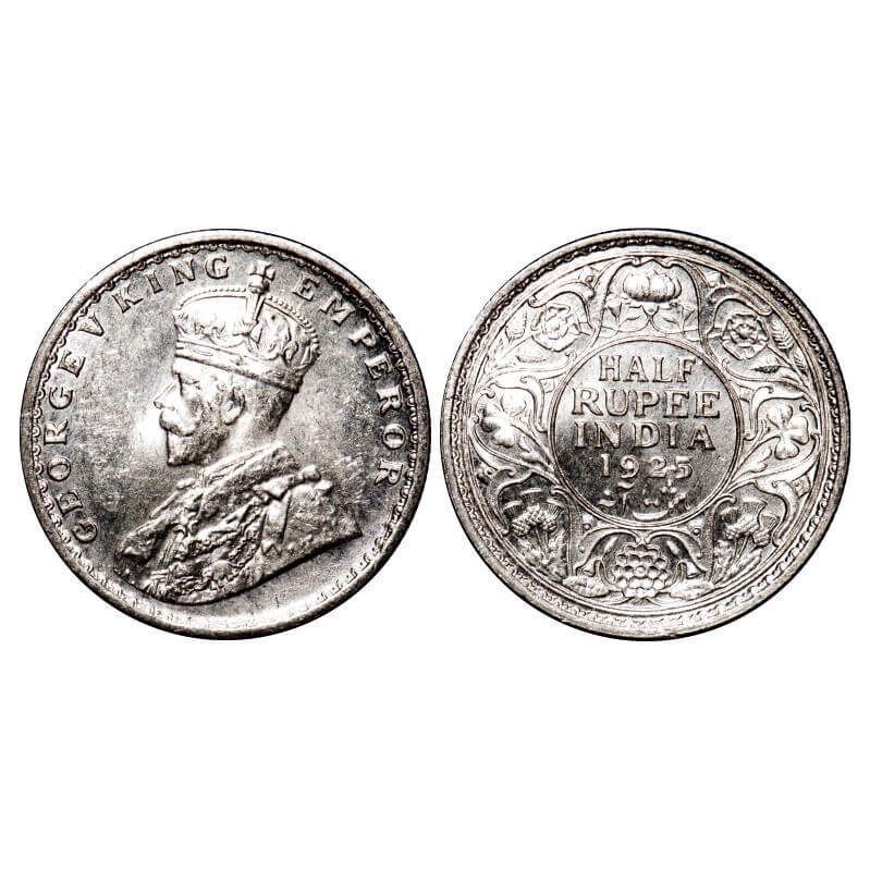 George V, Silver, Half Rupee, 1925, Calcutta Mint, No dot, Ghost on Rev. F. Prid 328. GK 1065. Mint State. Rare.
