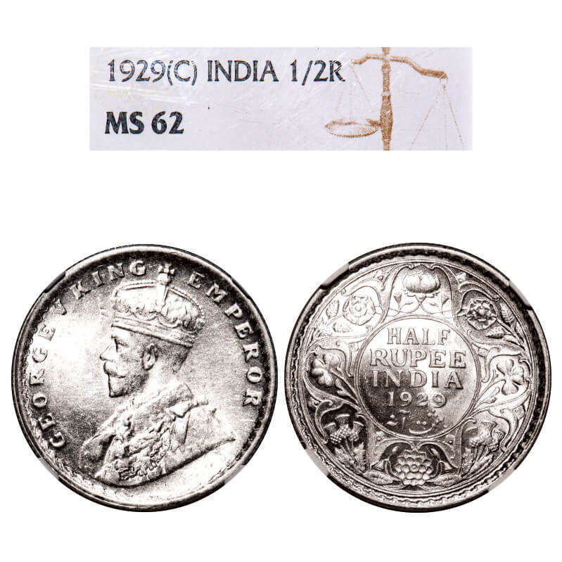 George V, Silver, Half Rupee, 1929, Calcutta Mint, No dot, Elephant. F. Prid 331. GK 1071. NGC Slab MS 62. Rare.