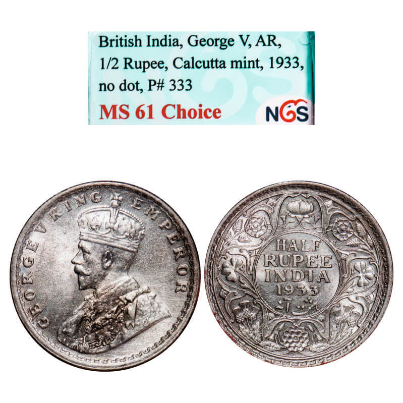 George V, Silver, Half Rupee, 1933, Calcutta Mint, No dot. F. Prid 333. GK 1073. NGS Slab MS 61 Choice. Very Scarce.