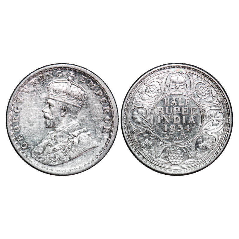 George V, Silver, Half Rupee, 1934, Calcutta Mint, No dot. F. Prid 334. GK 1074. About Uncirculated. Scarce.