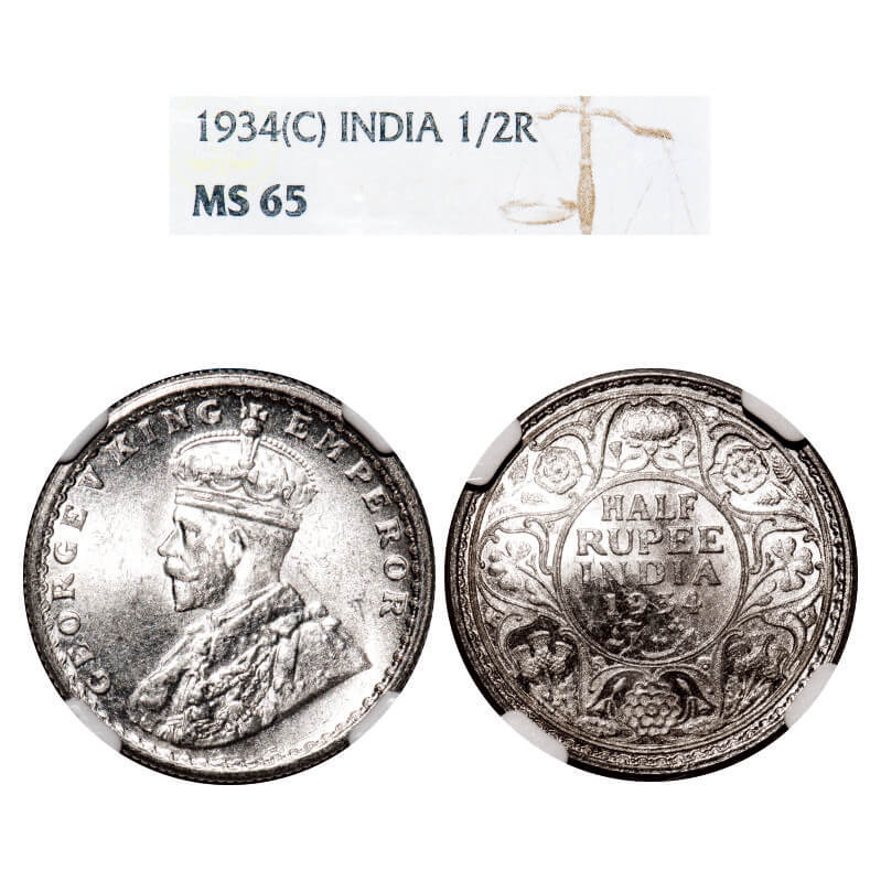 George V, Silver, Half Rupee, 1934, Calcutta Mint, No dot, Elephant. F. Prid 334. GK 1074. NGC Slab MS 65. Very Rare.