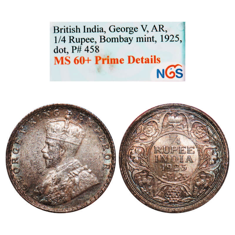 George V, Silver, 1/4 Rupee, 1925, Bombay Mint, Dot. F. Prid 458. GK 1093. NGS Slab MS 60+ Prime. Very Scarce.