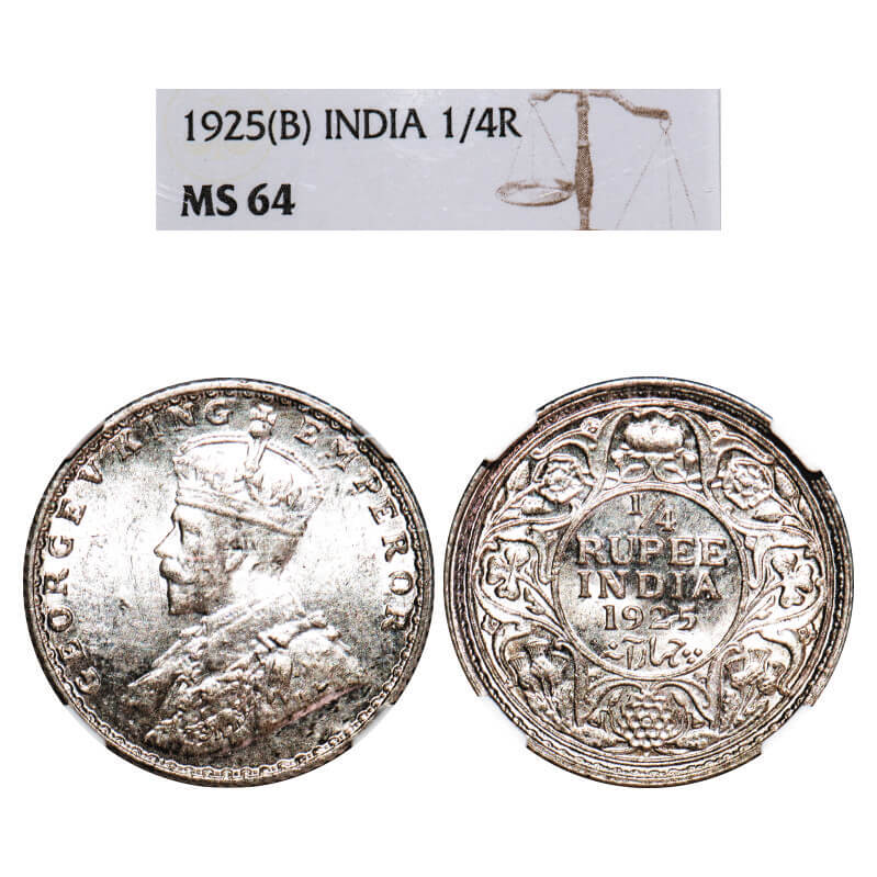 George V, Silver, 1/4 Rupee, 1925, Bombay Mint, Dot. F. Prid 458. GK 1093. NGC Slab MS 64. Very Scarce.