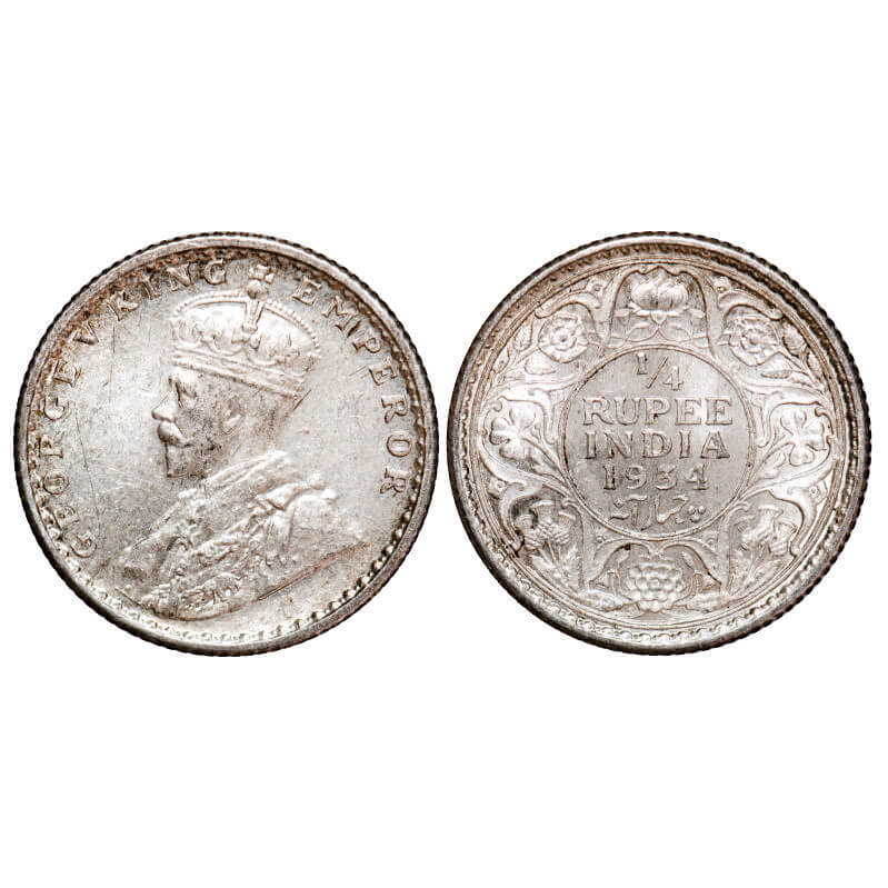 George V, Silver, 1/4 Rupee, 1934, Calcutta Mint, No dot. F. Prid 452. GK 1098. Uncirculated. Scarce.