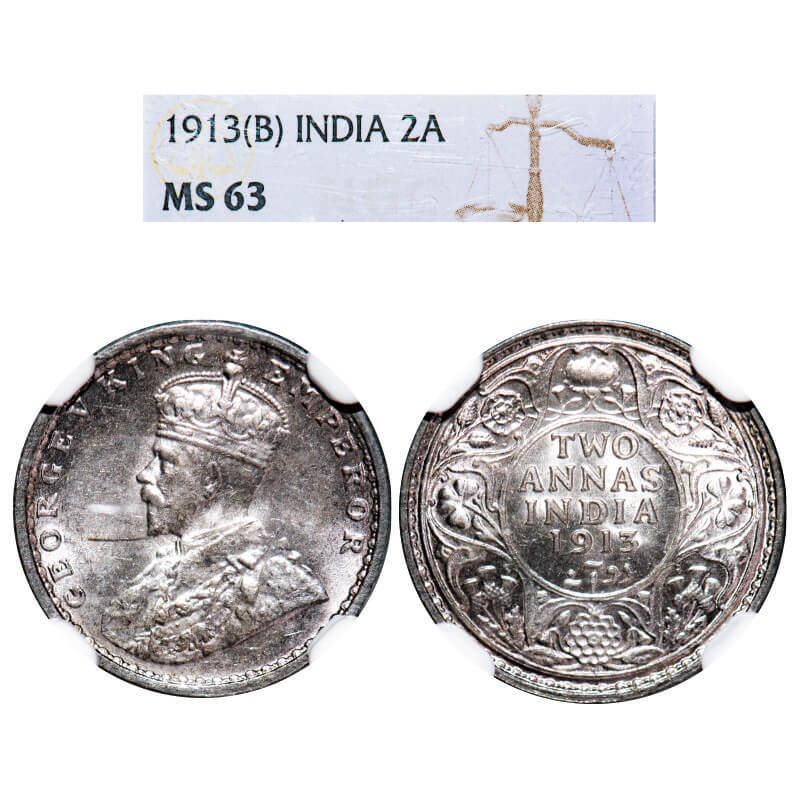 George V, Silver, 2 Annas, 1913, Bombay Mint, Dot. F. Prid 572. GK 1111. NGC Slab MS 63. Rare.