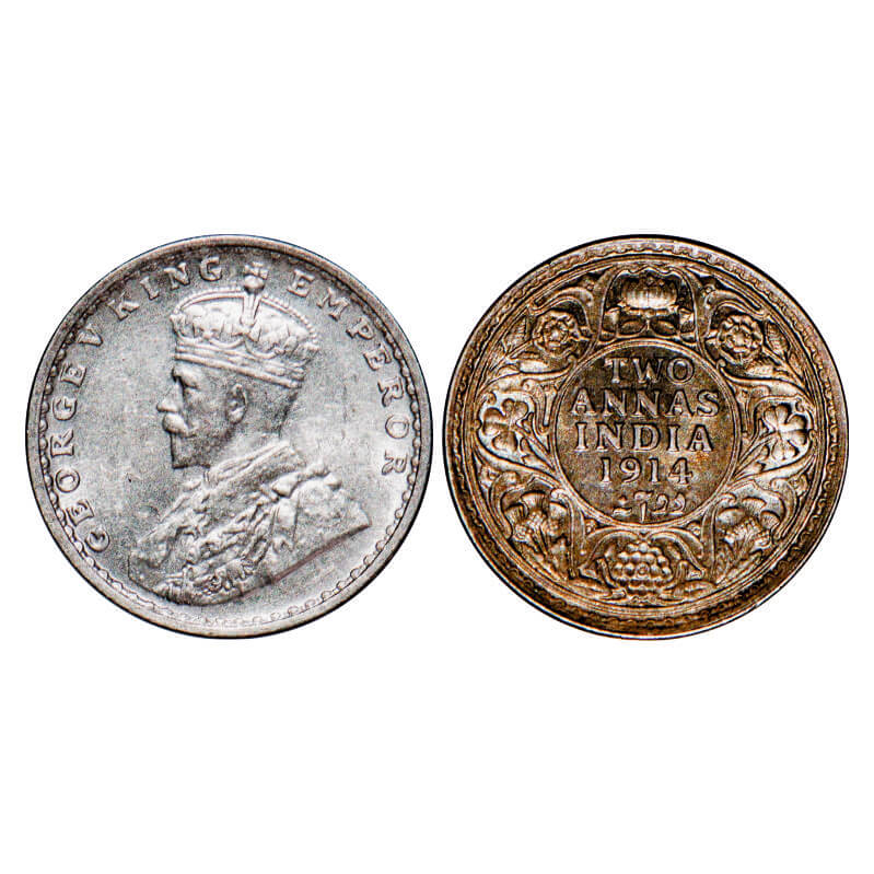 George V, Silver, 2 Annas, 1914, Bombay Mint, Dot. F. Prid 573. GK 1113. Uncirculated, Toned. Very ...