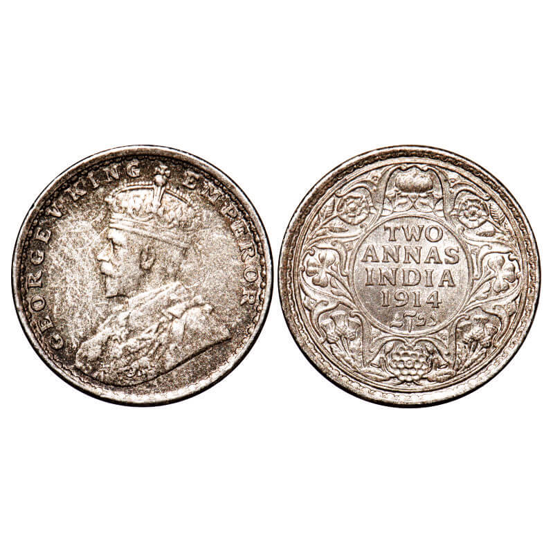 George V, Silver, 2 Annas, 1914, Bombay Mint, Dot. F. Prid 573. GK 1113. Uncirculated, Toned. Very Scarce.