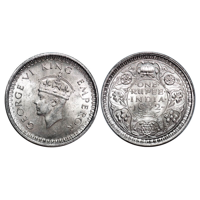 George VI, Mix-Metal, 1942 (1 slab, 1 coin), 1) Rupee, Half Silver, B/II, Diamond, Security edge, 2...