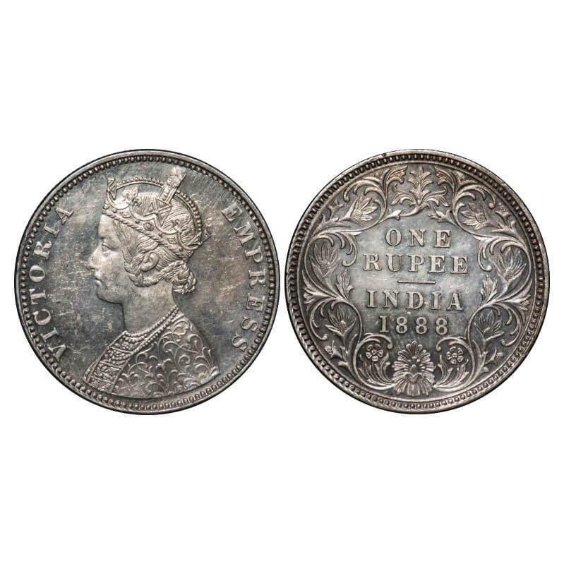 | Victoria Empress, Silver, Rupee, 1888, Bombay Mint, C2/I, 'B' raised, With Proof like finish and luster on Obv and Rev, Flat 1. F. Prid 174. GK 551. Mint State. Very Rare. |