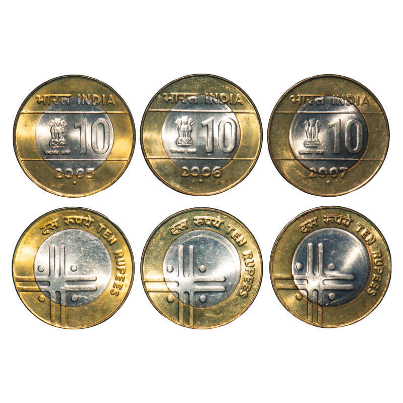 10 Rupees, 2005, 2006, 2007, Bimetal, (3 Coins), Cross depicting Unity and Diversity, Noida Mint. Brilliant Uncirculated. Scarce.