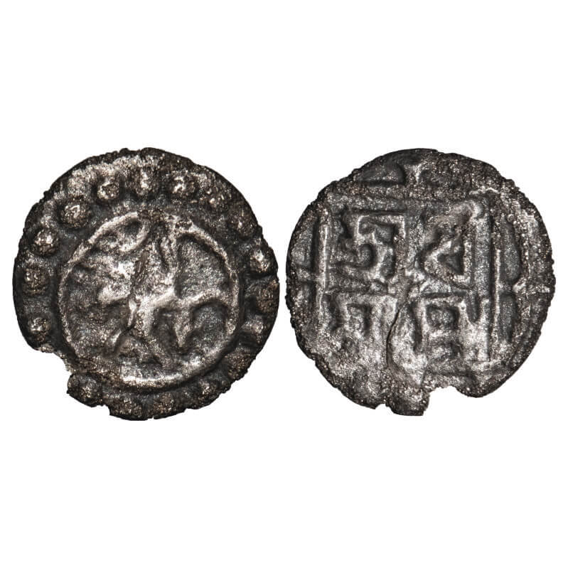 Tripura, Silver 1/16 Tanka, 0.55g, Dharma Manikya (SE 1636-1661 / 1714-1739 AD), Obv: Lion facing left with trident above, within circle with outer border of beaded annulets. Rev: Sri Dha/rmasya, in square with ornamented border. Rhodes & Bose 240. About Very Fine, Extremely Rare.