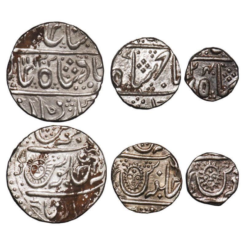| Indore, Silver, (3 Coins), Rupee AH 1202, ½ Rupee AH xxx7, ¼ Rupee AH 1240, Indore Mint, Sun face between 'seen' of julus. KM 76, 73, 72. Very Fine, Scarce. |