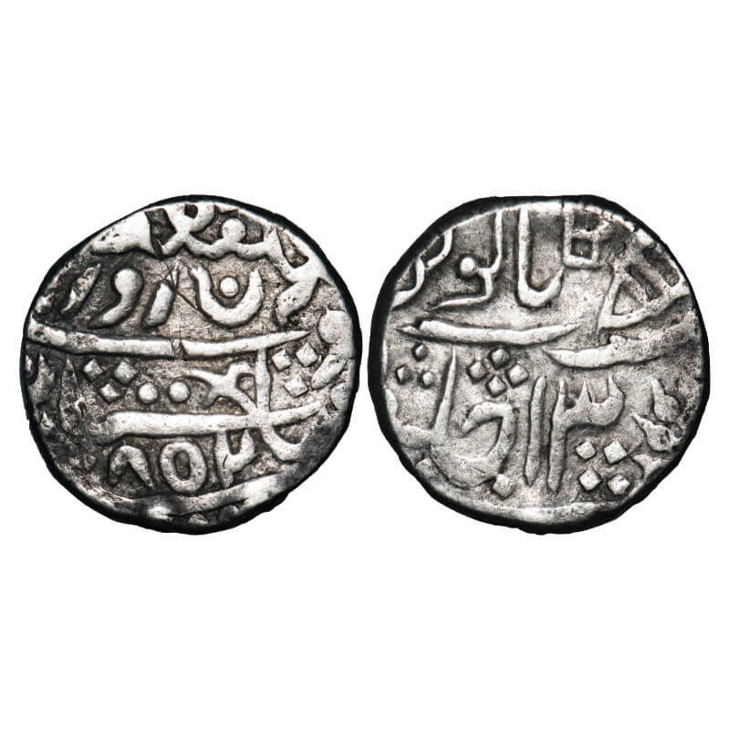 | Karauli, Silver Rupee, 11.00g, Nar Singh Pal (AH 1264-1268/1848-1852 AD), (Sawai Jaipur) Mint, 1852/13 RY, INO Muhammad Akbar II, Dagger and Jhar on reverse as mint mark. KM 44.2 type. Very Fine, Scarce. |