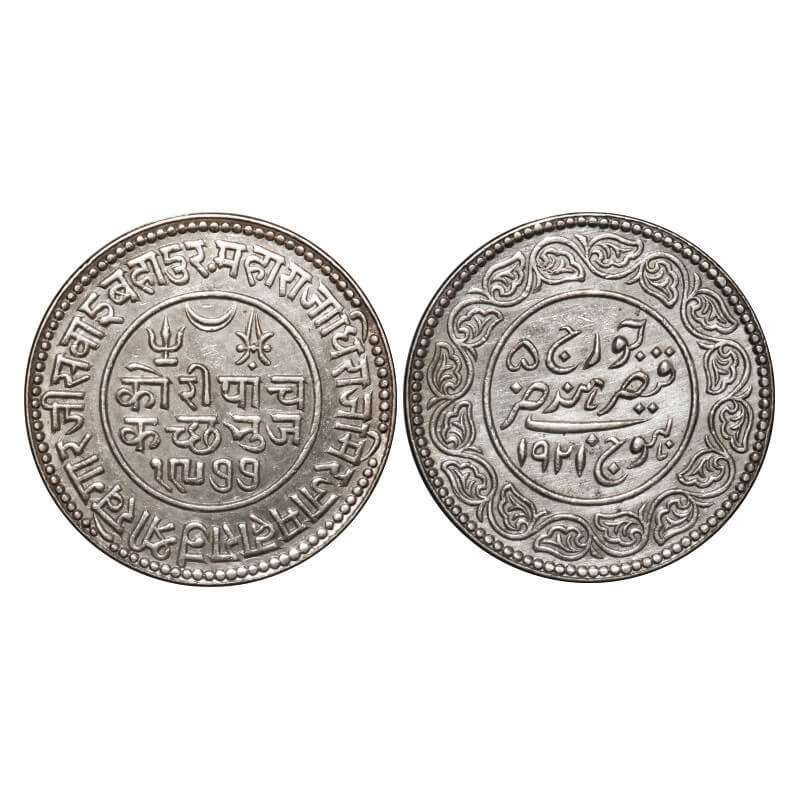 Kutch, Silver 5 Kori, 13.88g, Khengarji III, INO George V, VS 1977/1921 AD, Edge: KUTCH BHUJ reads clock wise seeing from obverse on top. Rajgor. 233.25. Extremely Fine+, Scarce.