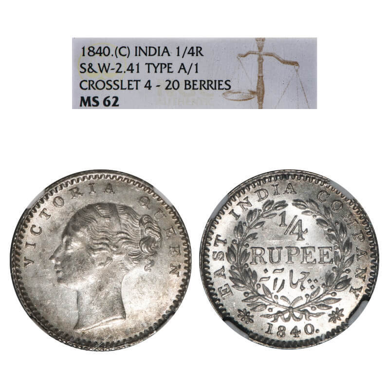 | Victoria Queen, Silver, 1/4 Rupee, 1840, CL, Calcutta Mint, A/I, English Head, Wreath with 20 Berries (10L + 10R). F. Prid 98. GK 124. NGC Slabbed MS 62. Very Rare. |