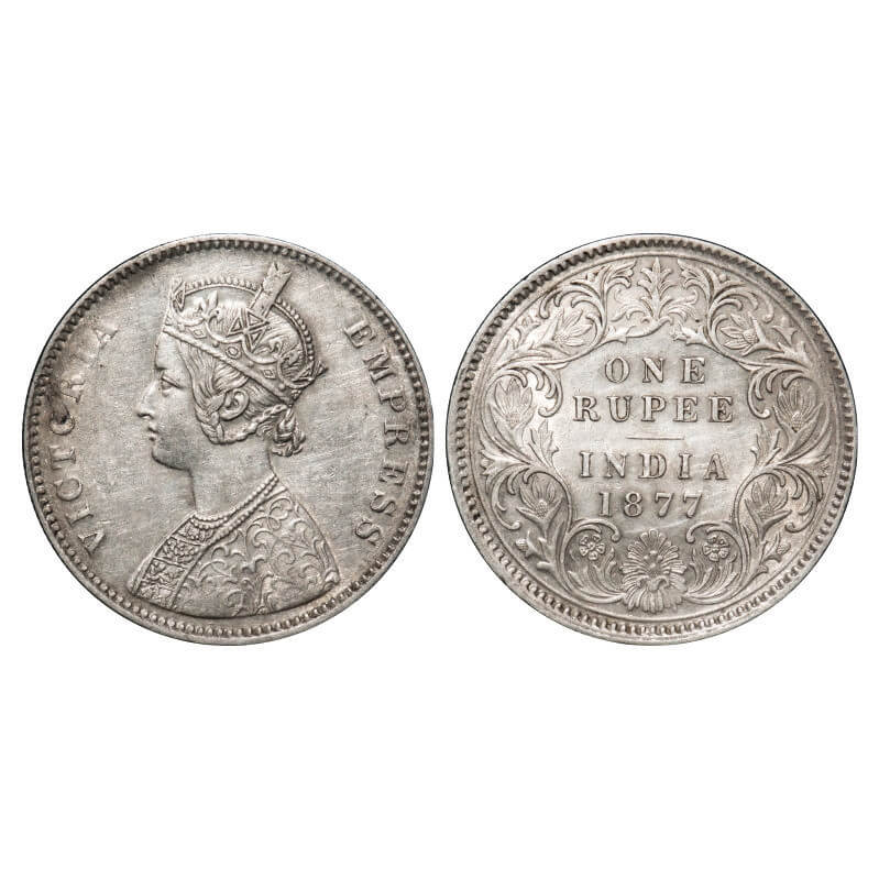 Victoria Empress, Silver, Rupee, 1877, Calcutta Mint, A1/I, No mint mark, Flat 1. F. Prid 115. GK 447. About Uncirculated. Scarce.