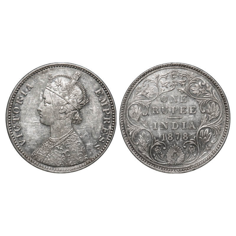 Victoria Empress, Silver, Rupee, 1878, Bombay Mint, A3/II(i), Dot, Inclined 1. F. Prid 151. GK 451. About Uncirculated. Scarce.