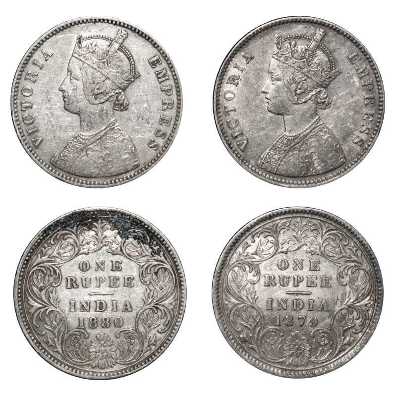 | Victoria Empress, Silver, Rupee, (2 coins), 1) 1879, Bombay Mint, A3/I, No dot, Flat 1, 2) 1880, Calcutta Mint, A1/I, 'C' incused, Flat1. F. Prid Unlisted, 118. GK 459, 468. Very Fine+ to Extremely Fine. Scarce. |