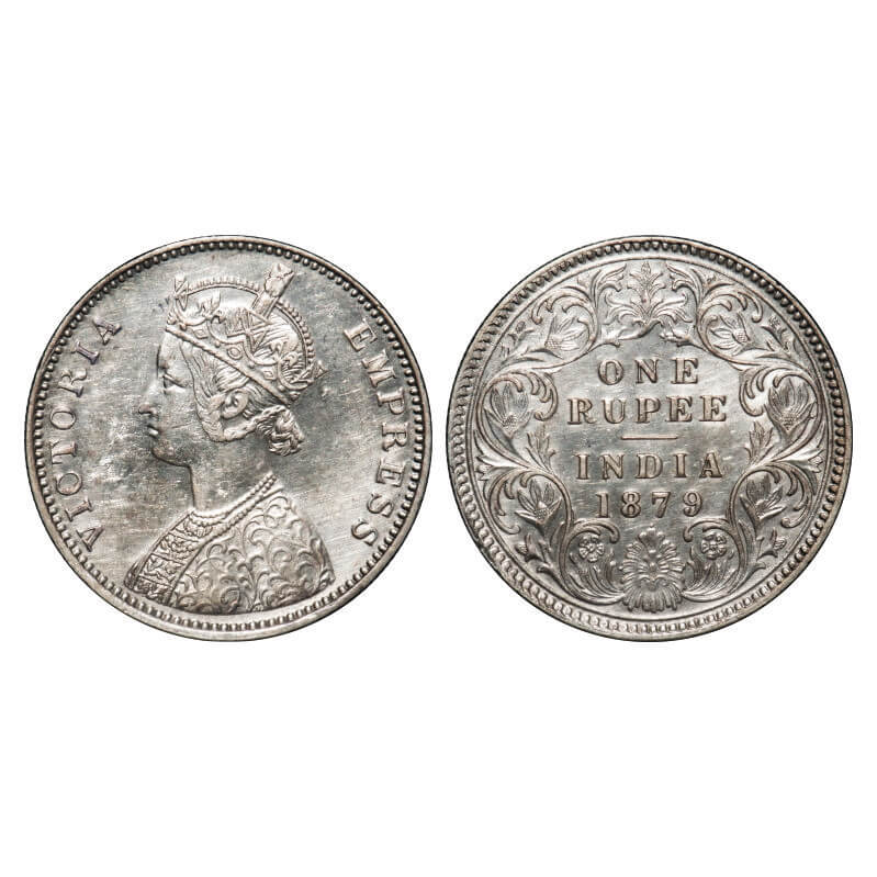 | Victoria Empress, Silver, Rupee, 1879, Bombay Mint, A3/I, Dot, Flat 1. F. Prid 154. GK 460. Almost Uncirculated, With luster. Very Scarce. |
