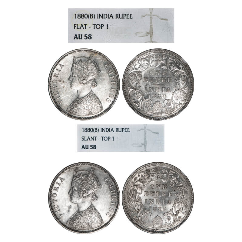 | Victoria Empress, Silver, Rupee, (2 slabs), 1880, Bombay Mint, 1) A3/I, Dot, Flat 1, 2) A3/II(iv), Dot, Inclined 1. F. Prid 156, Unlisted. GK 466, 467. NGC Slabbed AU 58(2). Very Scarce. |