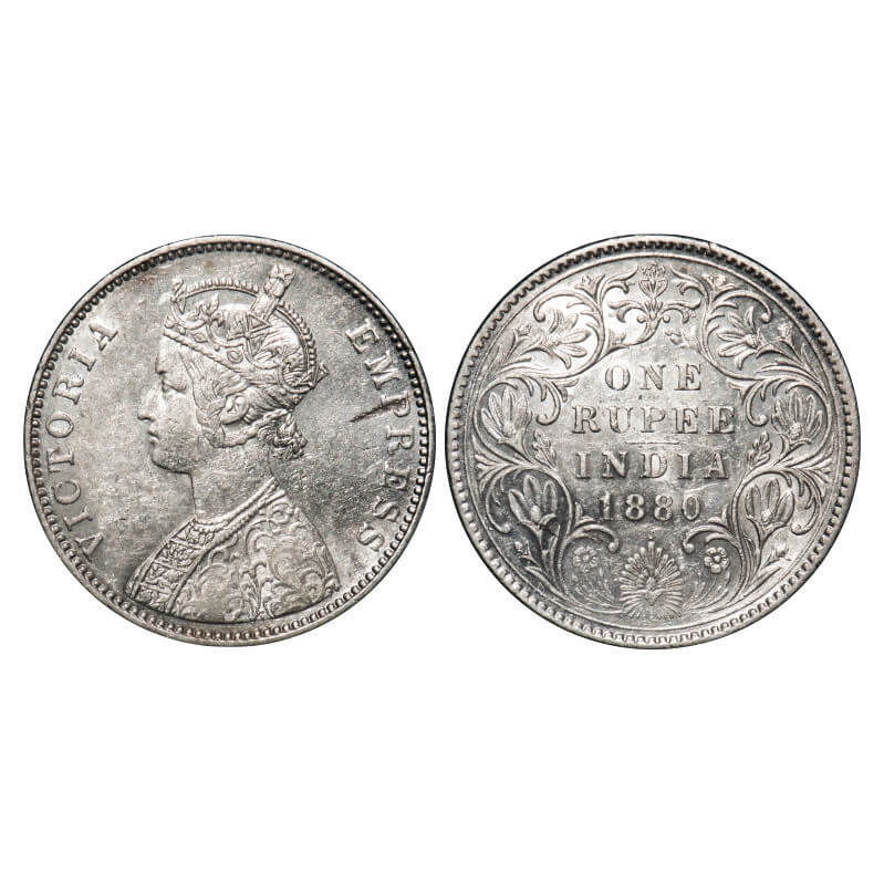 | Victoria Empress, Silver, Rupee, 1880, Bombay Mint, A3/II(iv), Dot, Inclined 1, Planchet flaw on Obv, Ghost on Rev. F. Prid Unlisted. GK 467. About Uncirculated. Very Scarce. |