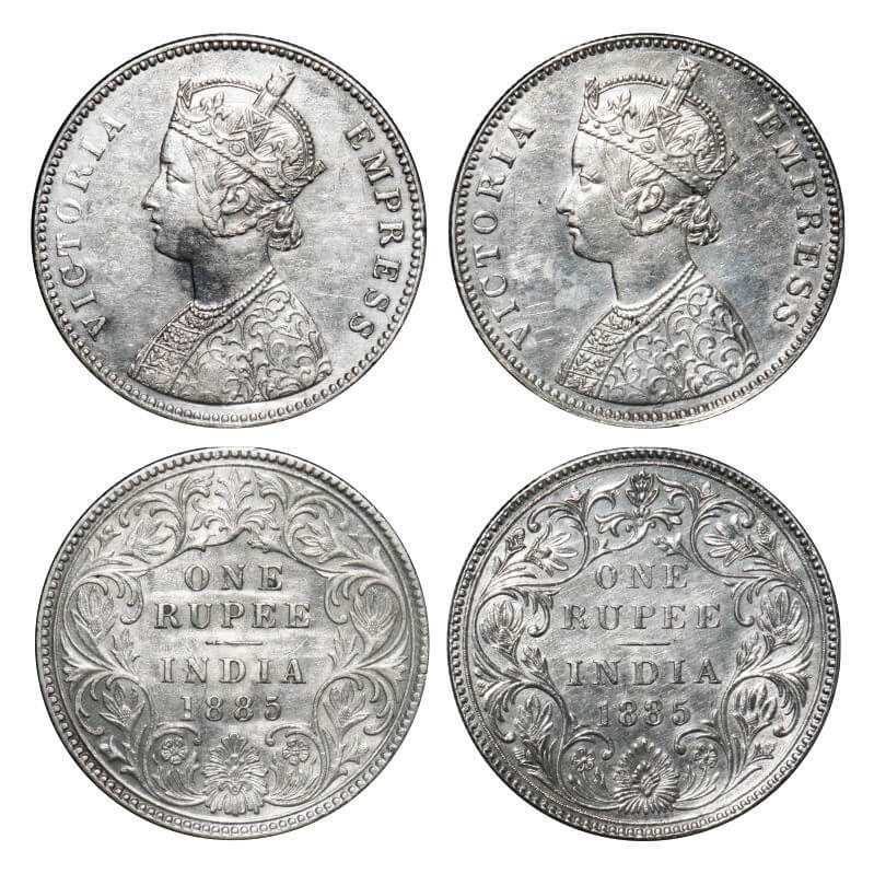 | Victoria Empress, Silver, Rupee, 1885, (2 coins), 1) Bombay Mint, A3/II(i), 'B' raised, Top stroke of numeral 5 short, Inclined 1, 2) Calcutta Mint, A1/I, 'C' incused, Top stroke of numeral 5 short, Flat 1. F. Prid 168, 124. GK 496, 518. Extremely Fine+ to About Uncirculated. Very Scarce. |
