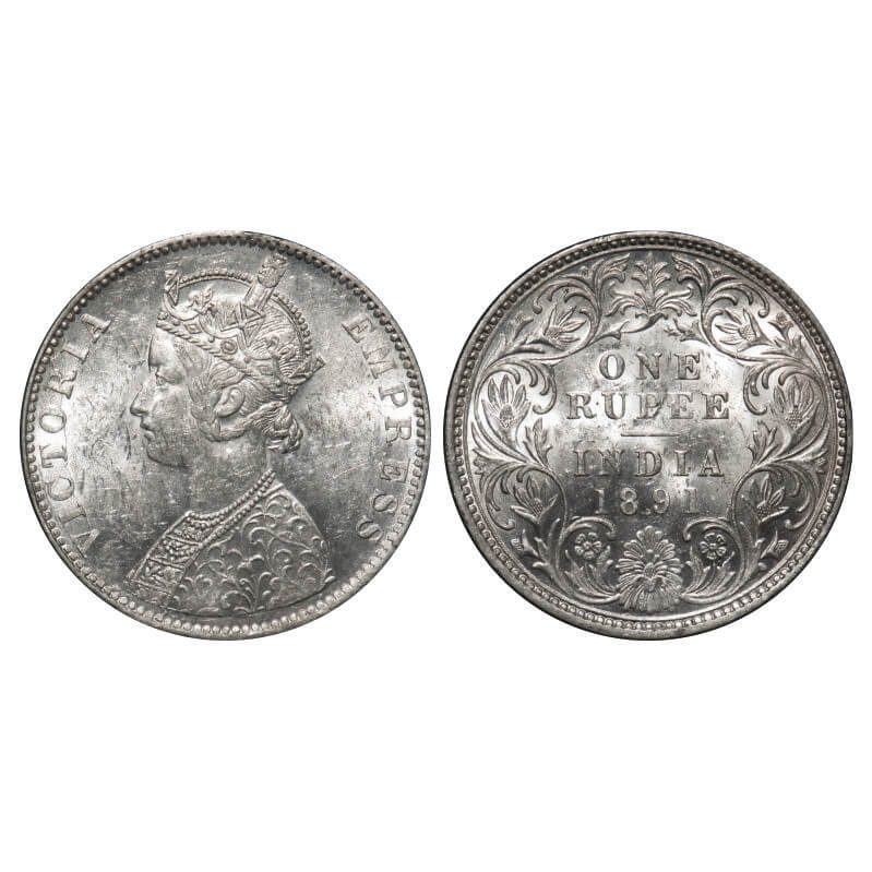 Victoria Empress, Silver, Rupee, 1891, Bombay Mint, C2/I, 'B' incused, Flat 1. F. Prid 179. GK 569. Brilliant Uncirculated. Rare.