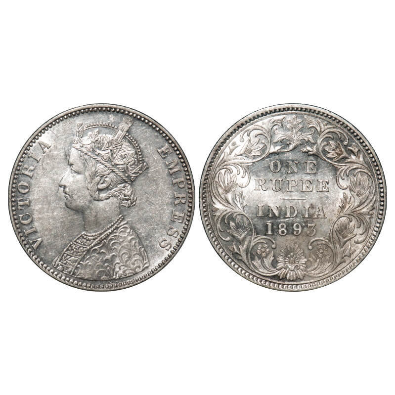 | Victoria Empress, Silver, Rupee, 1893, Bombay Mint, C2/I(ii), 'B' incused, Flat 1. F. Prid 182. GK 579. Uncirculated, with orignal mint luster. Very Scarce. |