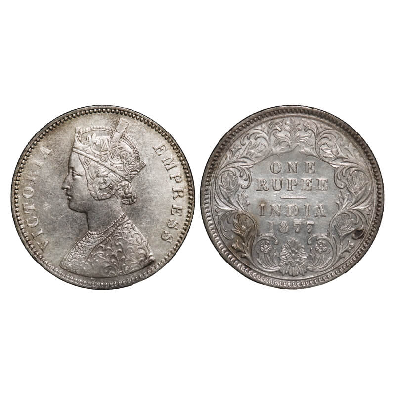 Victoria Empress, Silver, Rupee, 1877, Calcutta Mint, A1/I, No mint mark. F. Prid 115. GK 446. About Uncirulated. Very Scarce.
