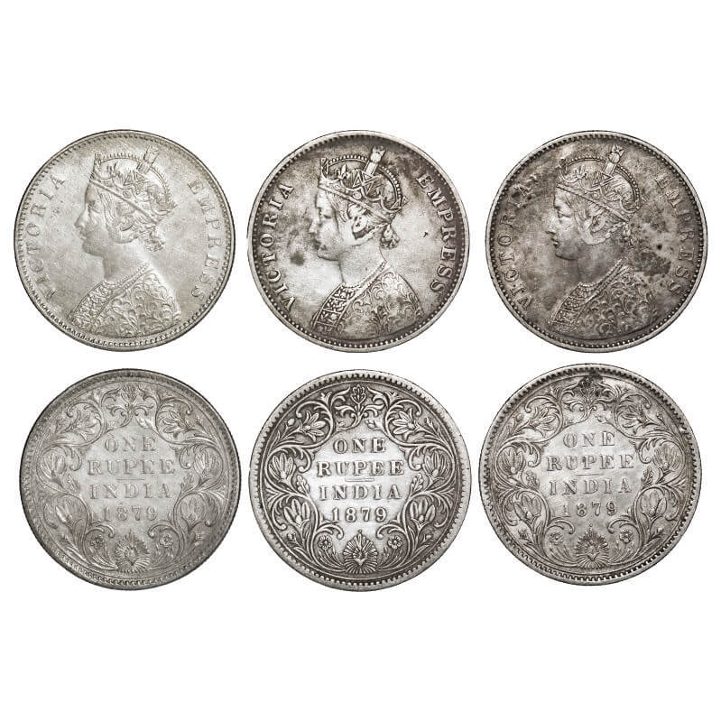 Victoria Empress, Silver, Rupee, 1879 (3 coins), Bombay Mint, A3/II(iv), Dot. F. Prid Unlisted(2). GK 462(3). Fine+ to Extremely Fine+. Scarce.