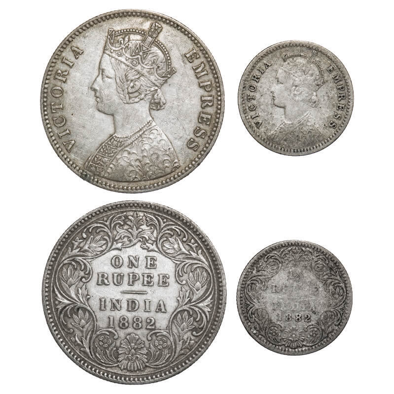 | Victoria Empress, Silver, 1882 (2 coins), Calcutta Mint, 1) Rupee, A1/I, 'C' incused, 2) 1/4 Rupee, C/II, 'C' incused. F. Prid 120, 387. GK 475, 687. Fine+ to Extremely Fine. Scarce. |