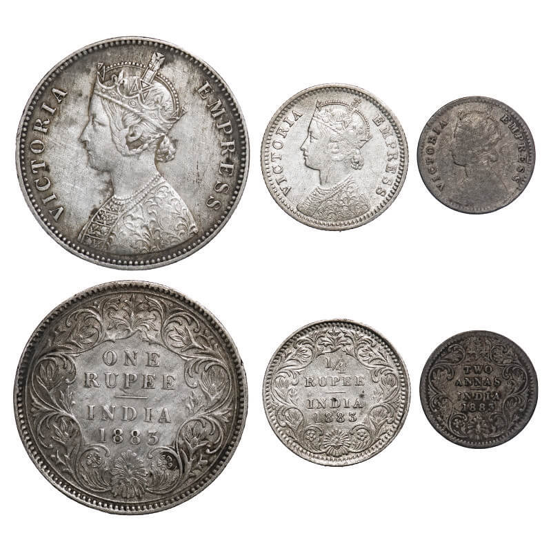 | Victoria Empress, Silver, 1883 (3 coins), Calcutta Mint, 1) Rupee, A1/I, 'C' incused, 2) 1/4 Rupee, C/II, 'C' incused, 3) 2 Annas, B/II, 'C' incused. F. Prid 122, 388, 498. GK 486, 692, 768. Fine to Very Fine+. Scarce. |