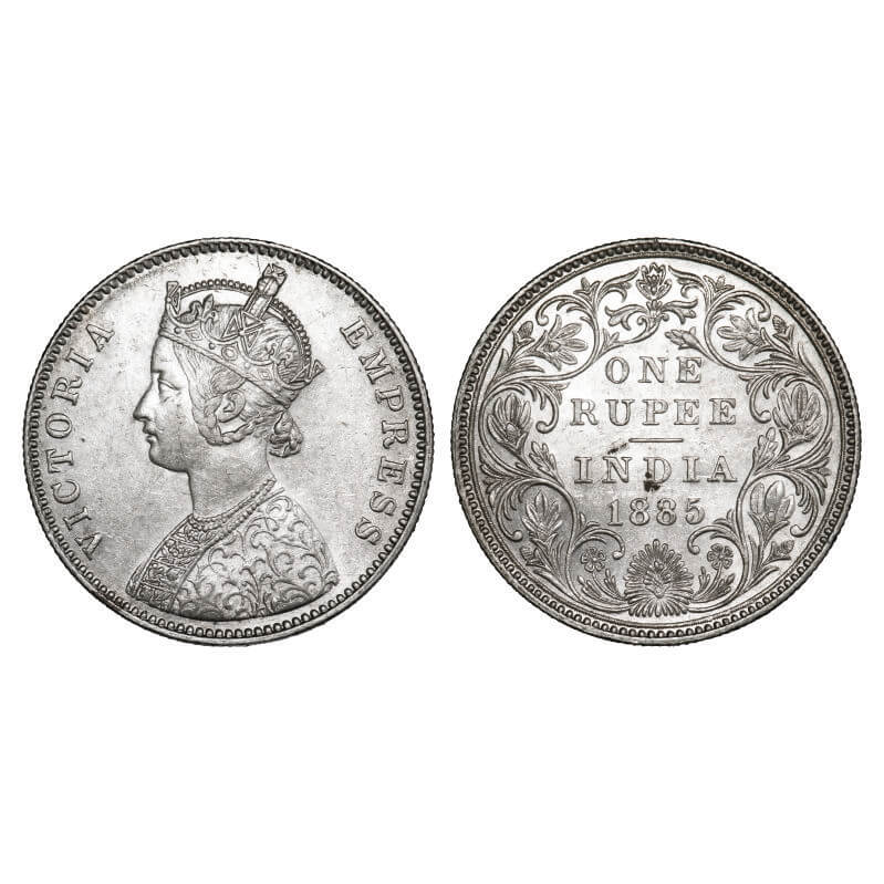 | Victoria Empress, Silver, Rupee, 1885, Bombay Mint, A3/II(i), 'B' raised, Top stroke of numeral 5 short, Die crack on Obv. F. Prid 168. GK 496. Extremely Fine+. Very Scarce. |