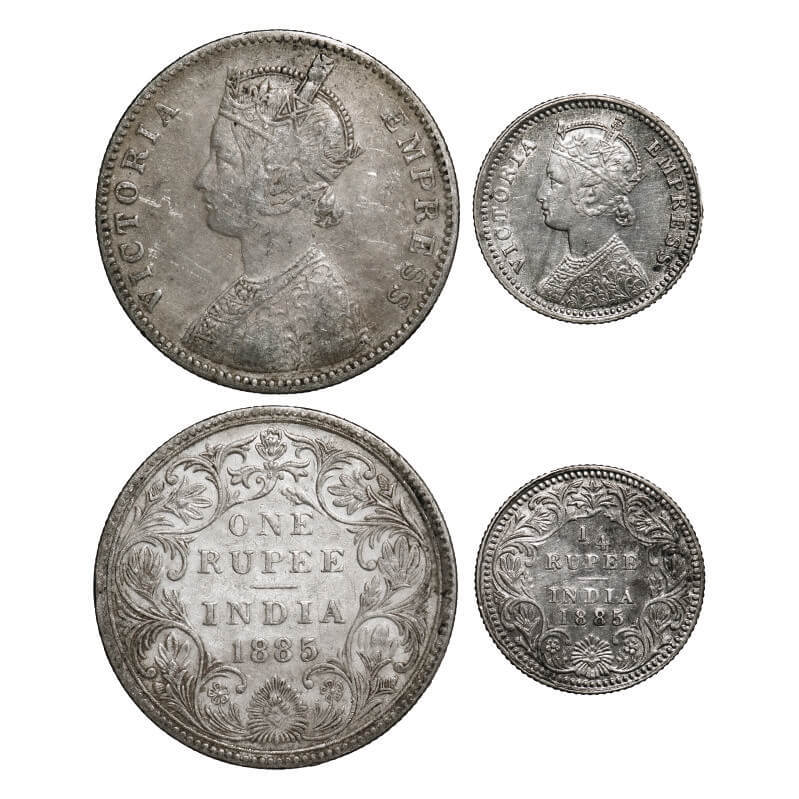 | Victoria Empress, Silver, 1885 (2 coins), 1) Rupee, Bombay Mint, A3/II(i), 'B' raised, Top stroke of numeral 5 long, 2) 1/4 Rupee, Calcutta Mint, C/II, 'C' incused. F. Prid 168, 390. GK 497, 702. Fine+ to Extremely Fine. Scarce. |