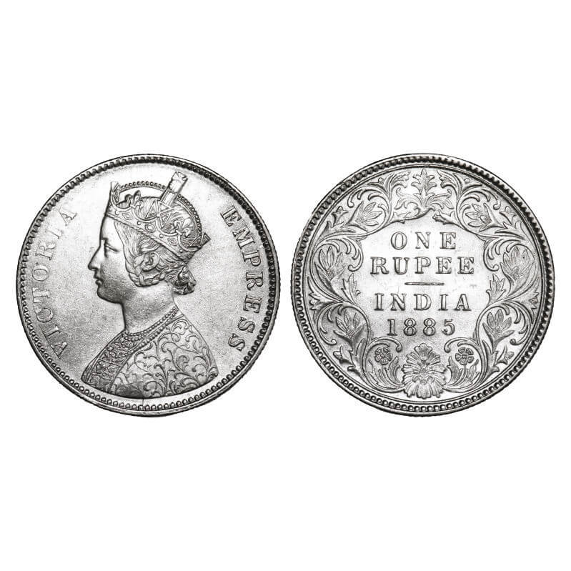 | Victoria Empress, Silver, Rupee, 1885, Calcutta Mint, A1/I, 'C' incused, Top stroke of numeral 5 short, Die crack on Obv, Ghost on Rev. F. Prid 124. GK 518. Almost Uncirculated. Very Scarce. |