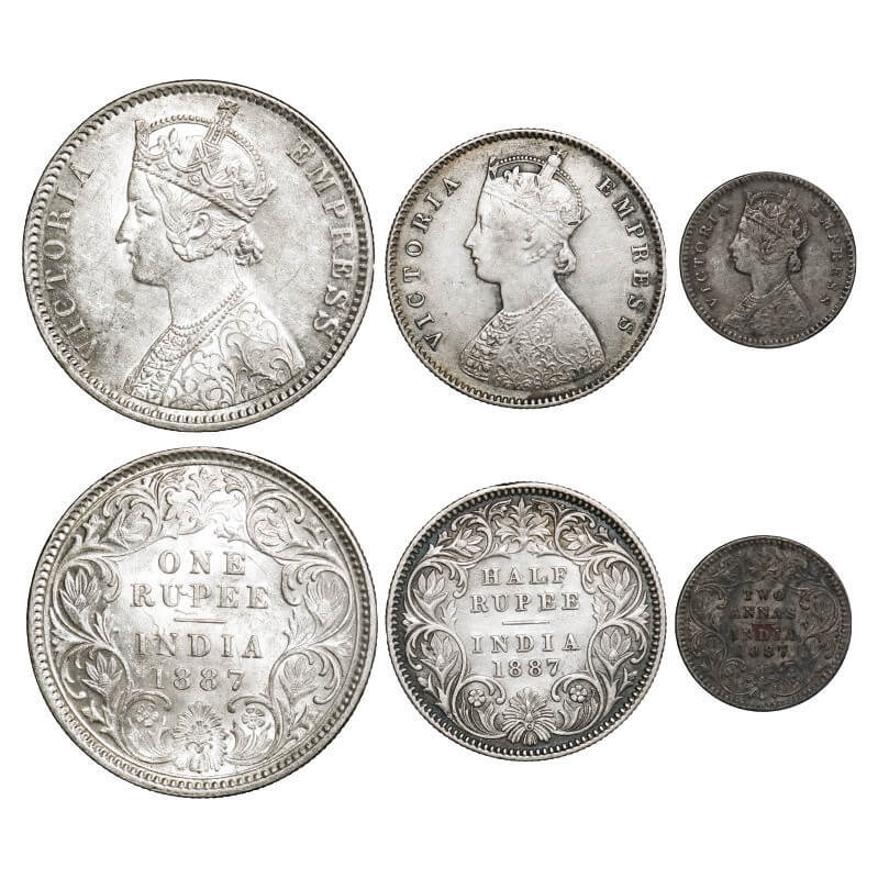 | Victoria Empress, Silver, 1887 (3 coins), Calcutta Mint, 1) Rupee, C3/I(i), 'C' incused, Thin numeral 7, 2) Half Rupee, A/I, 'C' incused, 3) 2 Annas, B/II, 'C' incused. F. Prid 128, 271, 502. GK 550, 637, 784. Very Fine+ to Uncirculated. Very Scarce. |