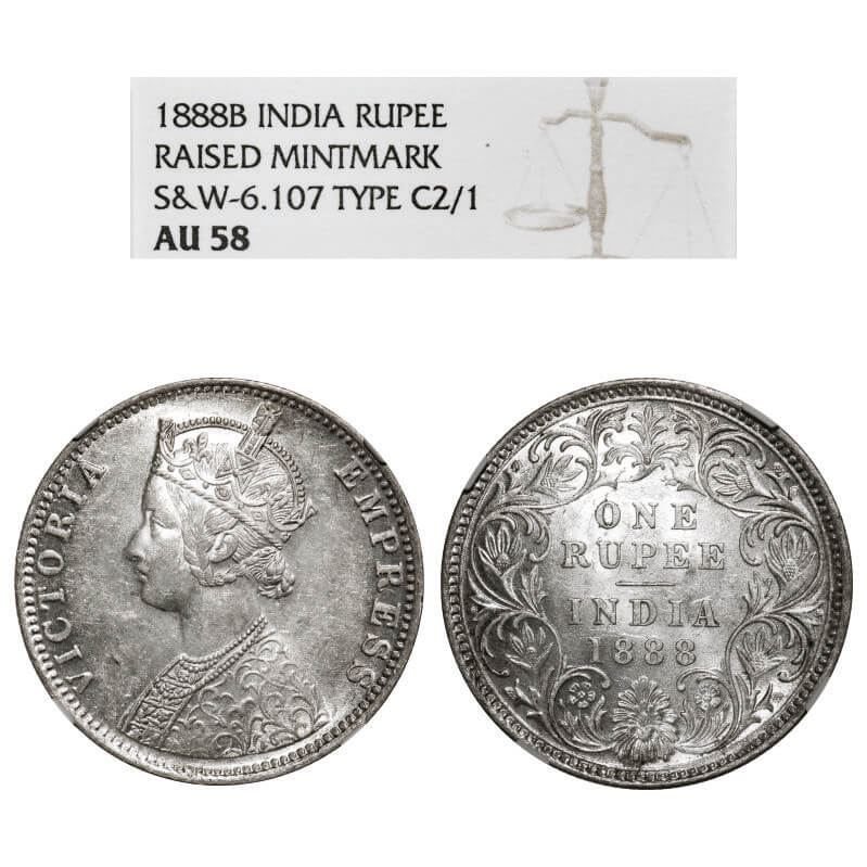 Victoria Empress, Silver, Rupee, 1888, Bombay Mint, C2/I, 'B' raised. F. Prid 174. GK 551. NGC Slabbed AU 58. Very Scarce.