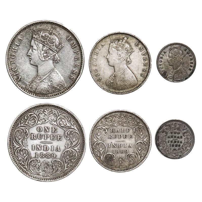 | Victoria Empress, Silver, 1889 (3 coins), Calcutta Mint, 1) Rupee, C3/I(i), 'C' incused, 2) Half Rupee, A/I, 'C' incused, 3) 2 Annas, B/II, 'C' incused. F. Prid 130, 273, 504. GK 565, 645, 788. Very Fine to Very Fine+. Very Scarce. |