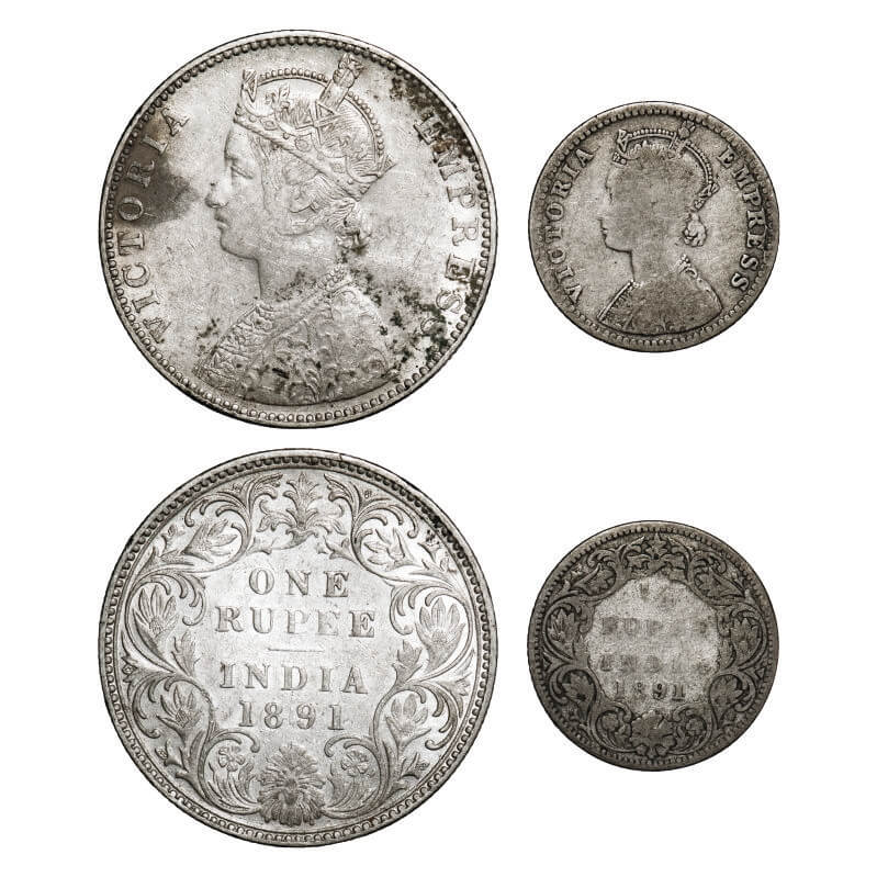 | Victoria Empress, Silver, 1891 (2 coins), Bombay Mint, 1) Rupee, C2/I, 'B' incused, 2) 1/4 Rupee, C(i)/I, 'B' incused. F. Prid 179, 425. GK 569, 720. Fine to Very Fine. Scarce. |